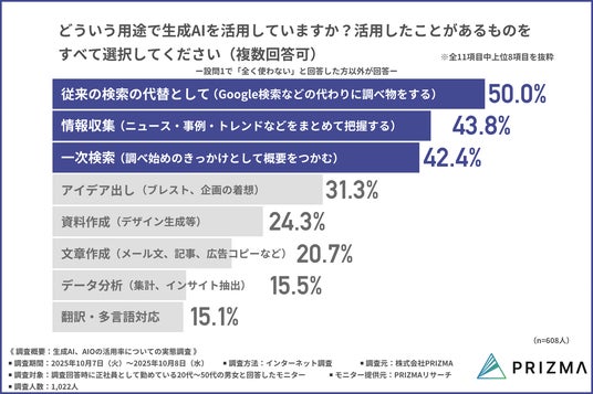 そこで今回、株式会社PRIZMA(https://www.prizma-link.com/press)は、正社員として勤めている20代~50代の男女を対象に、「生成AI、AIOの活用率についての実態調査」を実施しました。