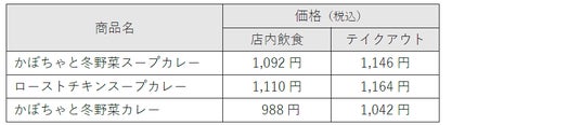 ※表示価格は「かぼちゃと冬野菜スープカレー」「ローストチキンスープカレー」はライス200g、辛さ普通の場合、「かぼちゃと冬野菜カレー」はライス300g、辛さ普通の場合の税込価格です。