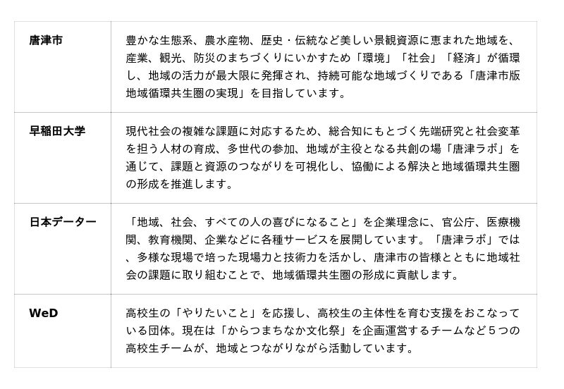 「唐津ラボ」は、地域循環共生圏の形成を目指すローカルSDGsの実践拠点として、唐津市・早稲田大学・日本データー・WeDの4団体が連携して設立した共創の場です。地域課題の可視化・解決に取り組み、持続可能な街づくりを目指します。