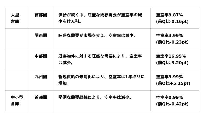本レポートは賃貸大型倉庫(10,000 平方メートル 以上)を中心に、首都圏、関西圏、中部圏、九州圏の市場動向をまとめたものです。また、約 1,300 物件、約 48 万坪(2025年7月末時点)のマスターリース物件の管理運営を行っている当社ならではのデータベースをもとに、賃貸中小型倉庫(1,000 坪未満/当社管理のみ)の情報も掲載しています。