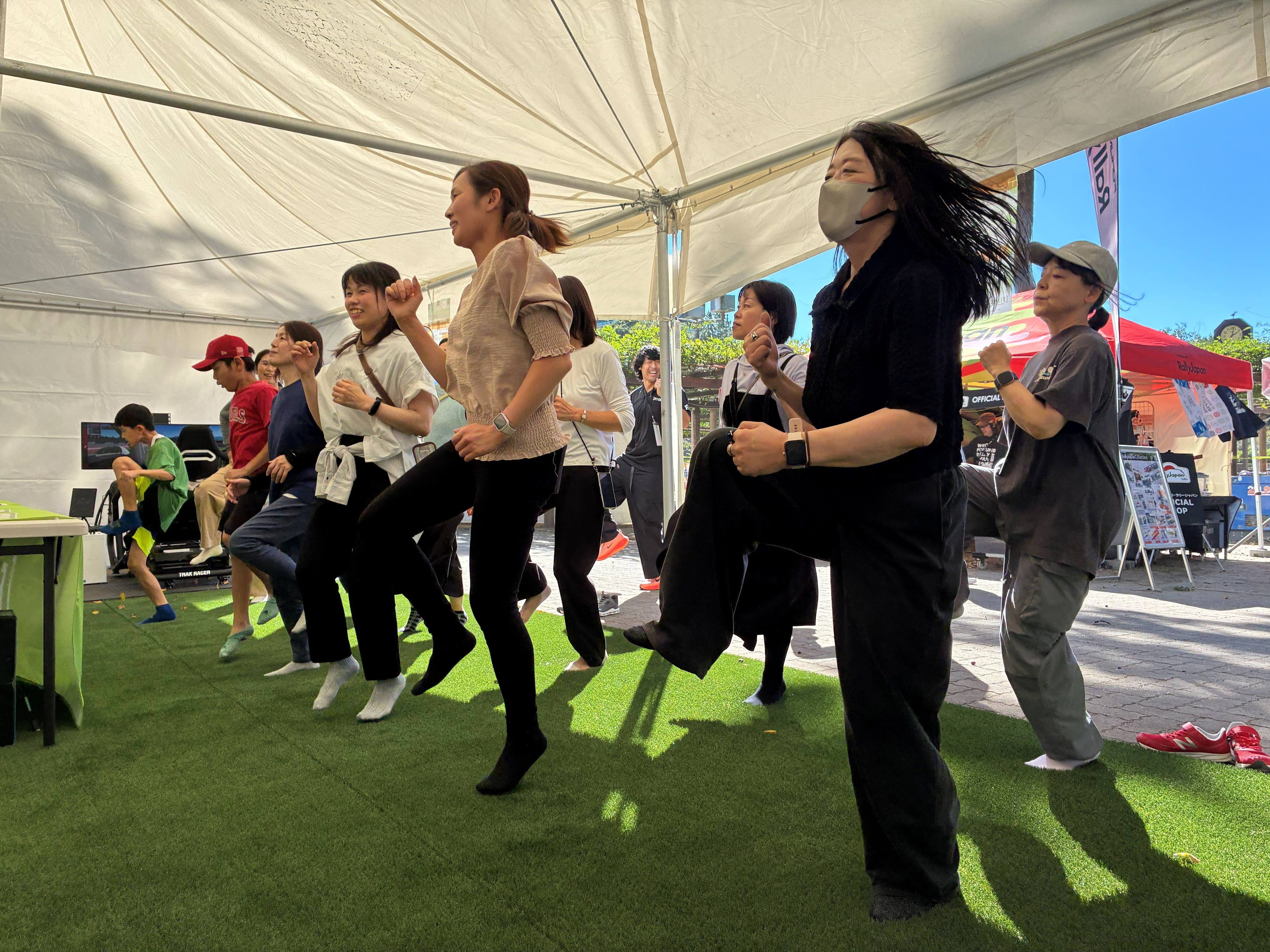 友人同士や家族連れなど多くの方が参加し、たろにぃさんの掛け声に合わせてスクワットやキックボクシングのアクションを楽しみながらおこなっていました。