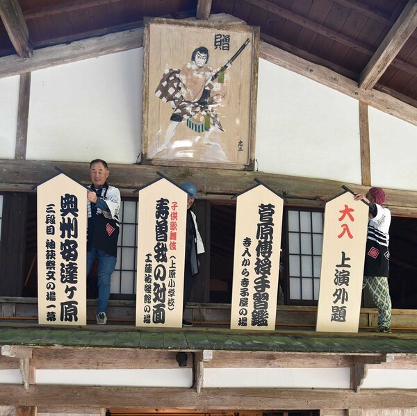 下呂市門和佐で受け継がれている白雲座歌舞伎の公演が11月2、3日に開かれる。本番を前に、演目を紹介する看板「まねき」を掲げる「まねき上げ」が23日、同所の白雲座で行われた。同歌舞伎保存会の会員が入り口上部にまねきを取り付け、迫る公演に向けて気運を高めた。