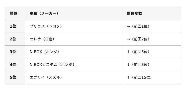 また、エブリイやハイエースバンのランク上昇から、商用・業務用途の需要拡大も見られます。