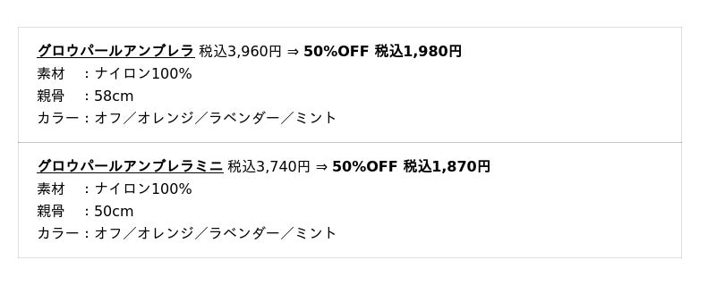 SNSで話題の雨傘・ビニール傘や機能性抜群な日傘はもちろん、レイングッズ、生活雑貨、キッズアイテム、直営店舗限定アイテムなど500種類以上の充実のラインナップ。全商品20~50%OFFとなっております。