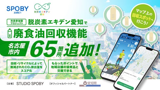 株式会社スタジオスポビー(東京都中央区、代表取締役 夏目恭行、以下「当社」)は、愛知県と連携した共同脱炭素プロジェクト「脱炭素エキデン愛知」において、家庭から出る廃食用油を回収しポイント化する「廃食油回収機能」にて、名古屋市内65箇所のスポットを追加いたしました。