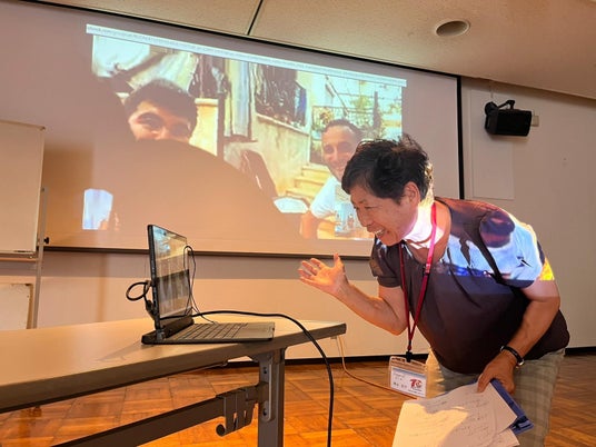 戦後0年のシリアとオンライン通話を行う青山桂子安八町教育長