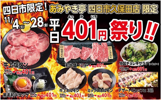 株式会社あみやき亭(本社:愛知県春日井市)は、四日市エリアの2店舗(四日市日永店・四日市久保田店)限定で、四日市(よっかいち)の名にちなんだ特別イベント「401(よっかいち)祭り」を開催いたします。
