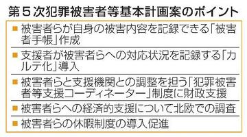 警察庁は4日、犯罪被害者らが自身の被害内容を記録できる「被害者手帳」の作成や、支援者が対応状況を記録する「カルテ化」の導入、北欧での経済的支援に関する調査などを盛り込んだ来春からの「第5次犯罪被害者等基本計画」案を公表した。5日から26日までパブリックコメント(意見公募)を実施し、来年3月に閣議決定する予定。