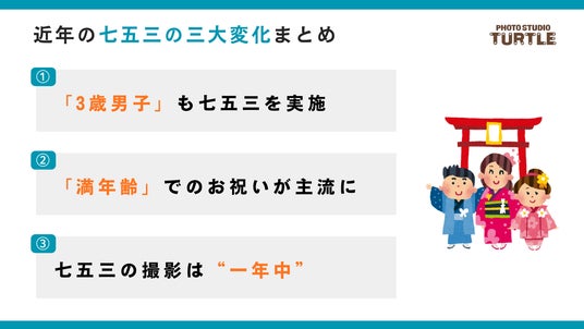 東海地方で25店舗のフォトスタジオを運営する株式会社タートル(本社:愛知県春日井市、代表取締役社長:亀山直樹)は、2023年度・2024年度に実施された最新2年間の七五三撮影データをもとに、近年の七五三に見られる「三大変化」をまとめましたのでお知らせいたします。年齢や時期にとらわれず、より“自由な七五三スタイル”が広がっています。
