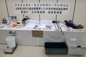 女性の書類送検容疑は7〜8月、アカミミガメやカミツキガメ、ウシガエル計8匹を販売目的で飼育するなどした疑い。