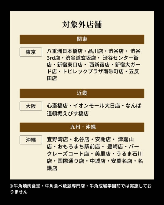 ※牛角食べ放題専門店、牛角焼肉食堂、牛角成城学園前店では実施していません。