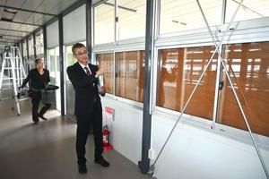 仮設校舎は授業用の教室に加え、理科実験室や保健室も入る。4日は、工事関係者らが電気設備などを整備していた。