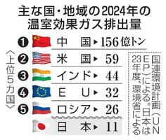24年の排出量が最も多かったのは中国で156億トン。米国59億トン、インド44億トン、欧州連合(EU)32億トン、ロシア26億トンと続いた。環境省によると、日本の排出量は23年度で11億トン。