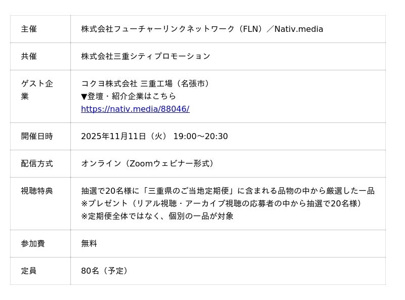 株式会社フューチャーリンクネットワーク(FLN)が運営するNativ.mediaは、三重県と共同でオンラインイベント「第4回 地域の仕事“ホンネ”サロン」を2025年11月11日(火)19:00~20:30に開催します。