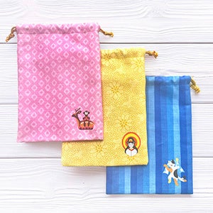 神話と伝説 巾着:立体感のある高級木綿にサテン裏地、江戸打ち紐で仕立てた巾着。御朱印帳や小物入れに。縁起柄で運気アップ!