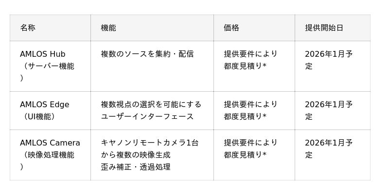キヤノンマーケティングジャパン株式会社(代表取締役社長:足立正親、以下キヤノンMJ)は、カメラ1台で会議・講義の参加者に複数視点を提供できるリモート会議ソリューション“AMLOS(アムロス)”の主要機能を、2026年1月よりソフトウェアコンポーネント形式で販売開始します。本サービスは、2025年11月19日(水)より幕張メッセで開催される「Inter BEE 2025」のキヤノンブースにて展示します。