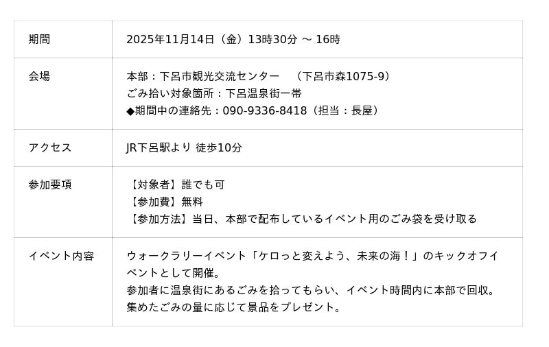 また、初日の14日(金)には、キックオフイベントとして、「温泉街をめぐるごみ拾いイベント」を開催し、温泉街の中心を流れる飛騨川周辺のごみ拾いイベントも実施します。ウォークラリーイベントの告知をすると共に、海洋ごみ削減の啓発活動として行います。(協力:(一社)下呂温泉観光協会)