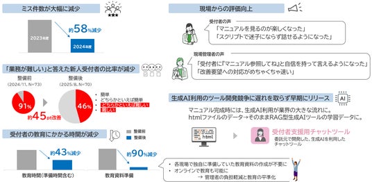 取組みによる成果として、マニュアルの再整理や、複雑で判断が難しいルールを自動判定するツール導入などの工夫により、ミス件数は58%削減でき、「業務が難しい」と回答した新人受付者は45Pt低減しました。受付者の教育時間は43%減少し、教育資料の準備にかかる時間も90%減少しました。