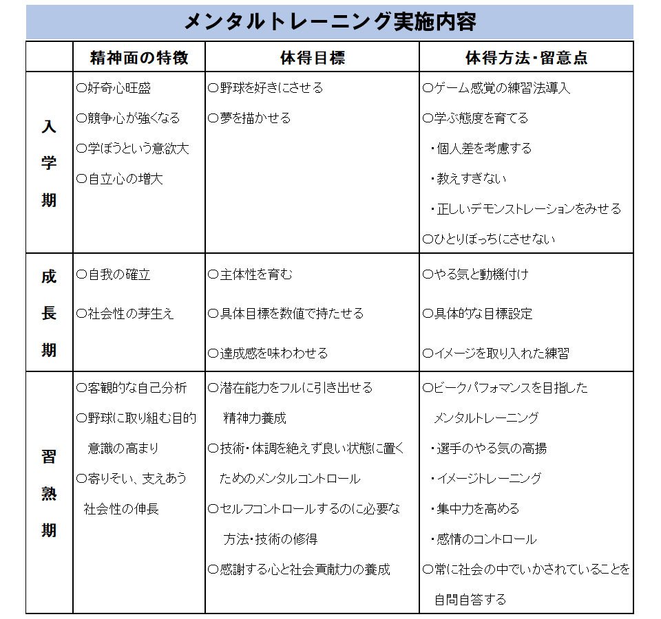 ①学ぶ態度(人間性)を育てる。この時期は、選手として完成させるのではなく、選手が伸びていくための土台作りをすることが先決である。