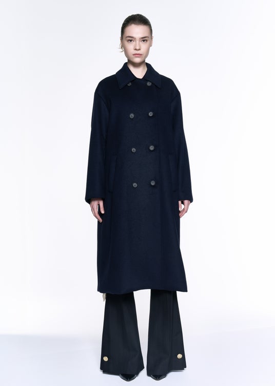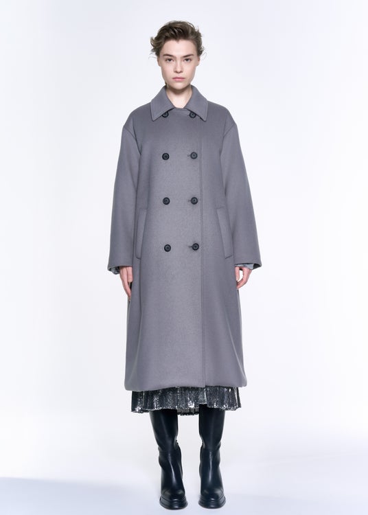 ロングコートはクラシックなダブルブレストをベースに、大きすぎない襟元が上品な印象を保ちながら、顔まわりをすっきりと見せます。羽織るだけで背筋が伸びるような端正な佇まいと、程よく肩の力が抜けたシルエットのバランスが魅力です。
