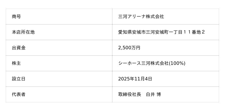 この度、シーホース三河株式会社が新会社となる「三河アリーナ株式会社」を設立したことをお知らせいたします。三河アリーナ株式会社は、西三河地域の社会貢献を目的として、2028年建設予定の三河安城交流拠点(新アリーナ)の運営等を担ってまいります。