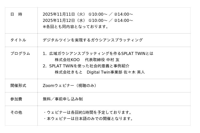 株式会社きもと(本社:三重県いなべ市、代表取締役社長:小林 正一)は、先端技術「ガウシアンスプラッティング(Gaussian splatting)」を活用した3D空間データ作成サービス「SPLAT TWIN」をテーマに、無料オンラインウェビナー「デジタルツインを実現するガウシアンスプラッティング」を開催いたします。