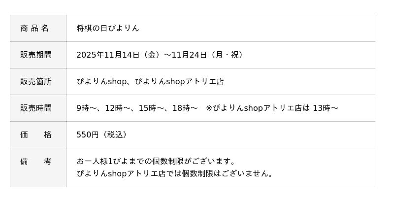 ジェイアール東海フードサービス株式会社(本社:愛知県名古屋市、代表取締役社長:岩下賢一)は、人気スイーツ「ぴよりん」の季節限定商品「将棋の日ぴよりん」を、11月17日の「将棋の日」に合わせて、2025年11月14日(金)~11月24日(月・祝)まで販売いたします。将棋のルーツ・インドにちなみ、同じくインド生まれの“チャイ”風味で仕上げました。