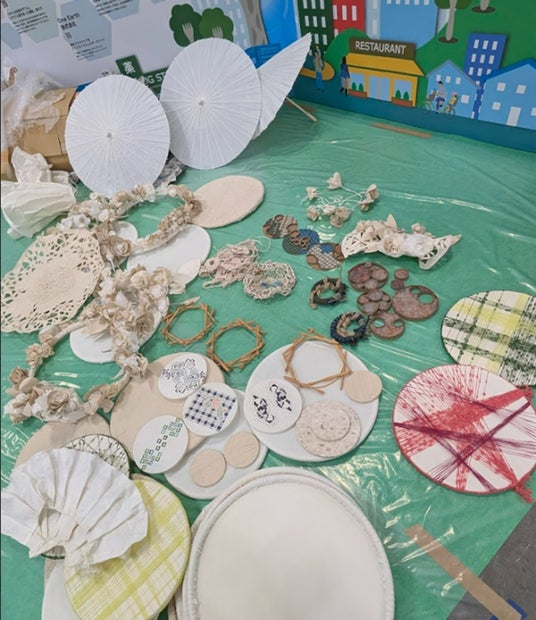 アップサイクル会員企業から提供されたゴムは材や生地などを使用して円形のオーナメントを制作しました。