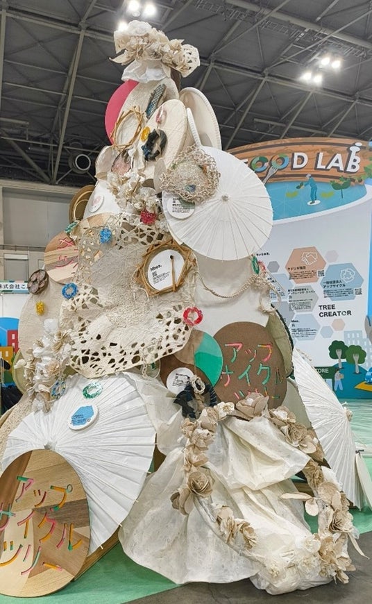 「アップサイクルツリー」は、「持続可能な食の未来へ」をコンセプトに、従来捨てられてしまうものに新たな価値を加えるアップサイクルという手法を用いて、その魅力と社会的意義を身近に感じてもらうプロジェクトです。今回、株式会社折兼が主催した展示会「FOODBIZ SUMMIT NAGOYA2025」の会場内中央にモニュメントとして設置されました。設置にあたっては一般社団法人アップサイクル(所在地:大阪市、代表理事 森原 洋)に参画する企業・団体・個人を中心に12社が素材提供や装飾物制作、設置協力で参加しました。インクルーシヴ・ジャパンは、使用後の紙資源や未利用な間伐材が生まれ変わった「アップサイクル水引」を用いて装飾物を制作しました。