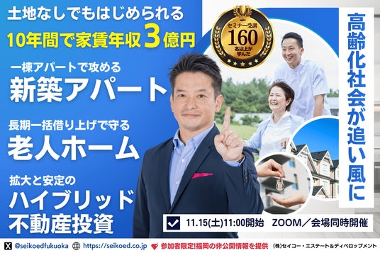 九州・福岡を拠点に新築アパート建築と不動産投資支援を行う株式会社セイコー・エステート&ディベロップメント(代表取締役:高木政利)は、2025年11月8日(土)に「攻めの新築アパート×守りの老人ホーム。拡大と安定のハイブリッド型不動産投資」をテーマにした不動産投資セミナーを開催します。本セミナーでは、1年で家賃収入3,000万円・10年で3億円を目指す資産形成のロードマップを公開し、土地を持たない会社員や医師、経営者でも参入できる現実的な手法を解説します。