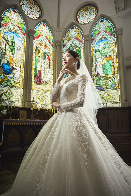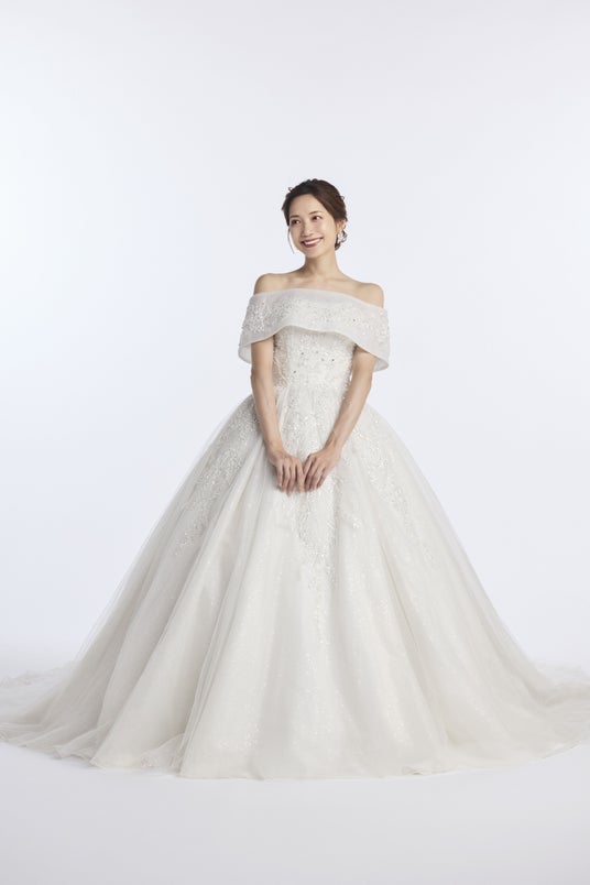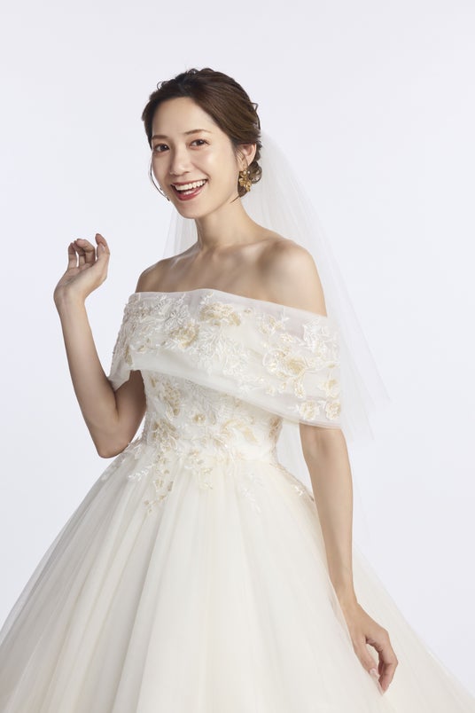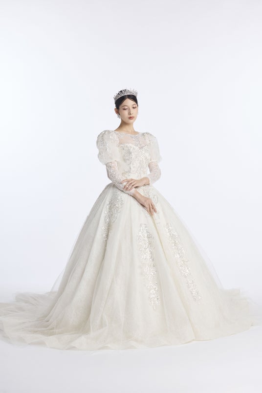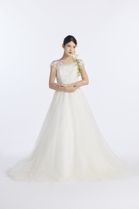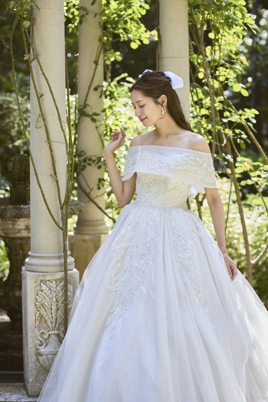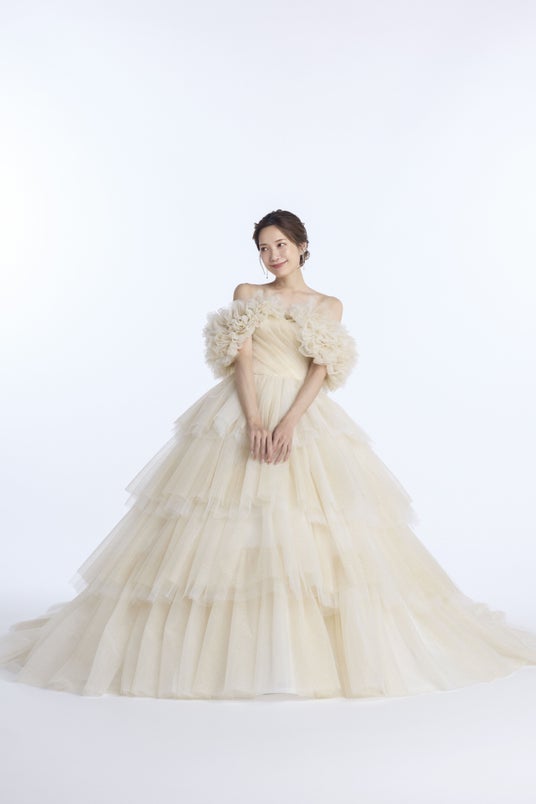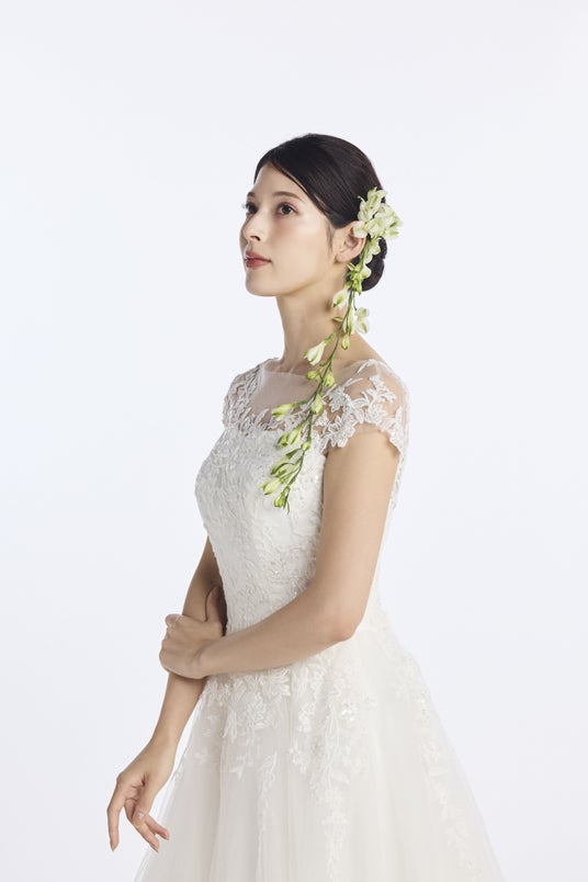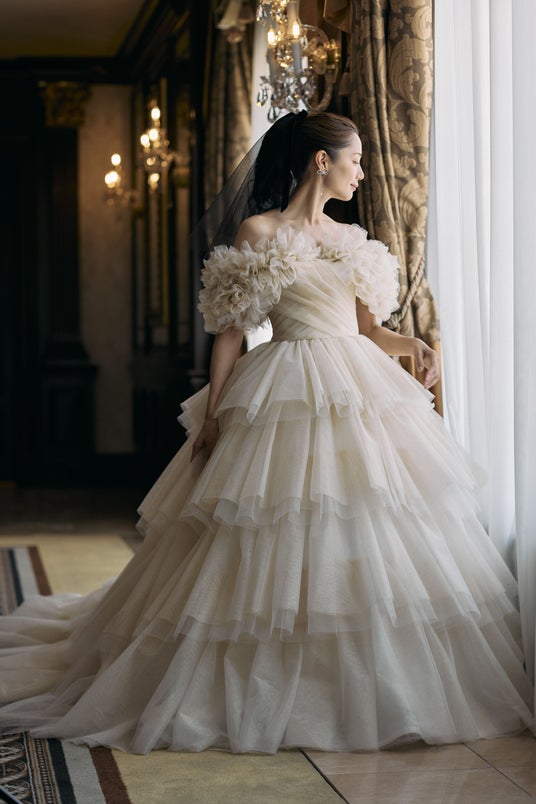 また、フォトウエディングでの見え方にもこだわり、写真映えする立体感と光の透け感を追求。自然光の中でもスタジオ撮影でも、美しく存在感を放つウエディングドレスに仕上げました。