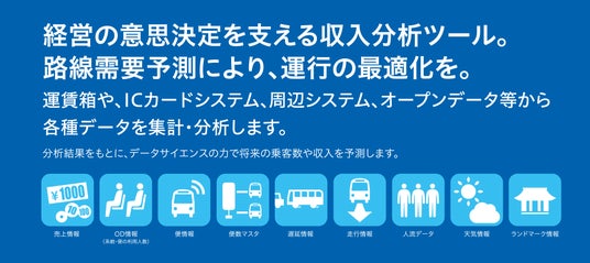 製品名:運行最適化支援システム路線バスやコミュニティバスなどの運賃箱やICカードリーダーから出力されるデータを自動で収集・集計し、経営分析に必要なレポートを自動作成するクラウドサービスです。