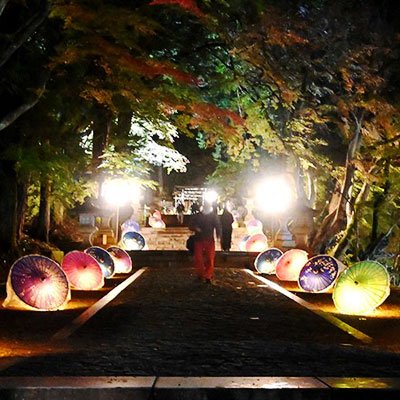 岐阜県高山市城山の日枝神社で、和傘のライトアップや音楽など和テイストで境内を彩る「日枝宵灯(よいあかり)もみじ祭」が16日までの土、日、祝日に開かれており、参拝者を幽玄な空間にいざなっている。