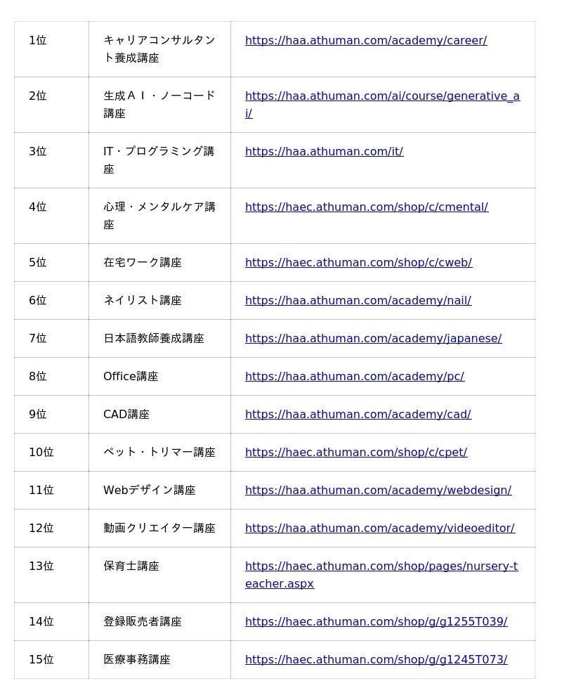 教育事業を展開するヒューマンアカデミー株式会社(本社:東京都新宿区、代表取締役:今堀健治、以下「当社」)の社会人教育事業「資格取得・就転職の総合校 ヒューマンアカデミー」は、社会人向けスクールで提供している全300以上の講座のラインナップから、2025年11月のおすすめ講座ランキングTOP15をまとめました。