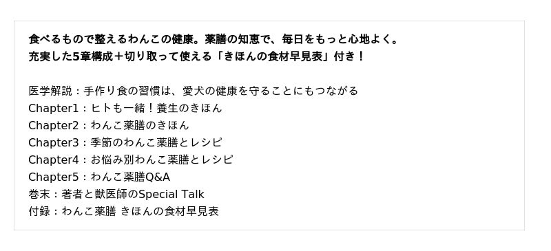 本書は、獣医師推奨のわんこのための薬膳入門書として中医薬膳に特化し、初心者向けにやさしく解説しています。「おいしいごはんで、健康寿命をのばす!」をコンセプトに、若い元気なわんこから持病持ち、シニアなどすべてのわんこに寄り添ったからだ作りを食事面からサポートします。