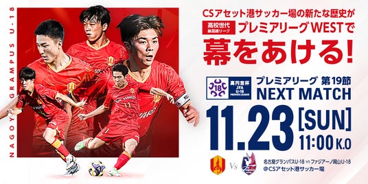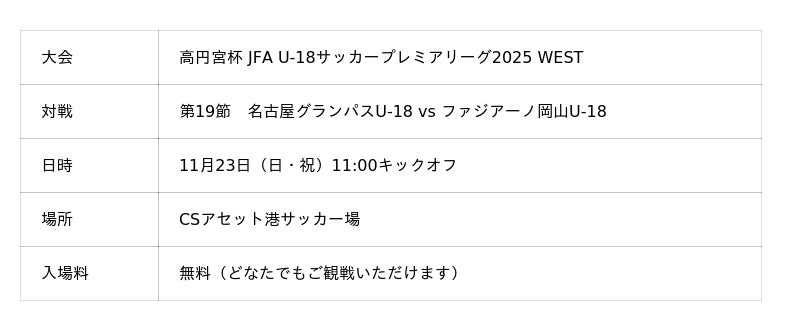 愛知・名古屋で開催されるアジア・アジアパラ競技大会の開催に向けて、改修工事を行っておりました「CSアセット港サッカー場」がリニューアルされます。この新しくなった施設を一足先に体験できるイベントとして、11月23日(日・祝)に「高円宮杯 JFA U-18 サッカープレミアリーグ 2025 WEST」 第19節 名古屋グランパスU-18 vs ファジアーノ岡山U-18の試合と、名古屋グランパススクールコーチによるサッカー教室を開催することとなりましたのでお知らせいたします。