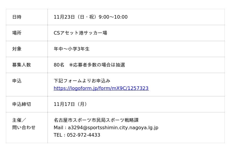 なお試合観戦は無料、サッカー教室は事前申込制となります。