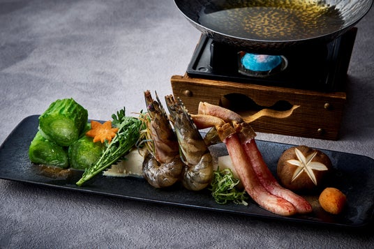 かつおの香り立つ出汁の小鍋では、当日に活けで仕入れる新鮮な地元産の車海老と、そのままでもお召し上がりいただけるズワイ蟹をしゃぶしゃぶして、お好みの茹で加減で。ぷりっぷりの海老、口の中でほどける蟹の味わいを食べ比べてお楽しみいただけます。