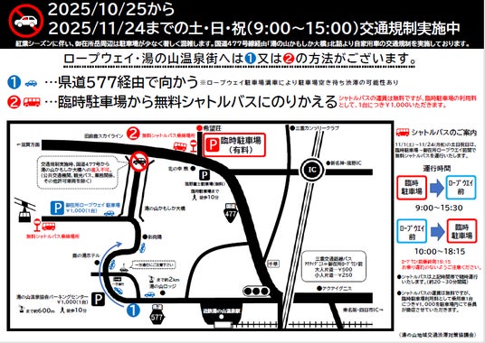 マイカーでお越しの方は臨時駐車場をご利用のうえ、シャトルバスで湯の山温泉・御在所ロープウエイ前までお越しください。スムーズに移動いただけます。
