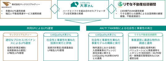 この度、当社は、不動産ファンド運営や投資家や物件に関する幅広いネットワークを有する株式会社マックスリアルティーと株式会社りそな不動産投資顧問との共同提案を行いました。当社は、共同無限責任組合員(以下「共同GP」)とサブアセットマネージャーとして参画しております。