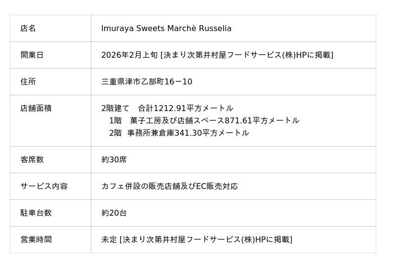 井村屋グループの事業会社、井村屋フードサービス株式会社(本社:三重県津市、社長:中島伸子)は「アンナミラーズ」「La maison JOUVAUD」(ラ・メゾン・ジュヴォー)「菓子舗井村屋」などのスイーツブランドを1拠点にて販売するアトリエ兼店舗「Imuraya Sweets Marche Russelia」(イムラヤ スイーツ マルシェ ラッセリア)を2026年2月上旬に三重県津市にオープンします。アメリカンパイ・南仏プロヴァンス スイーツ・和菓子、それぞれで蓄積してきた特色を活かし、近隣エリア・観光で訪れるお客さまに新しい価値提供を進め、津市 市街地のにぎわいを創出することに貢献してまいります。