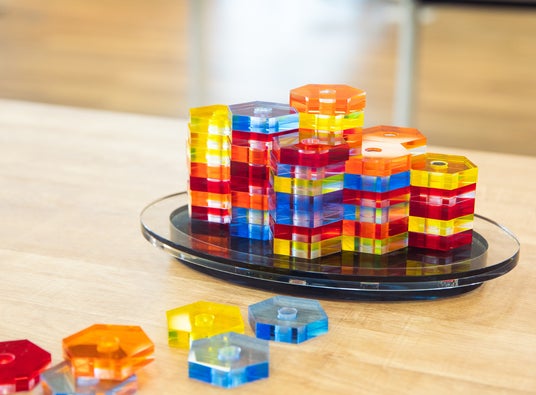 画像の説明:六角形の赤青オレンジ黄色のパーツが積み重なった様子