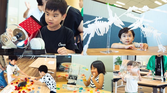 画像の説明:「アクリライト会 サマーフェスティバル2025」にて、アクリルで作られた玩具で遊ぶ子どもたち