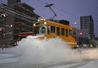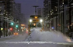 夜明け前の同日午前4時50分ごろ、雪が降りしきる中、市の車両基地から1台が出発。車体の前方に取り付けた竹製ブラシ「ササラ」を回転させ、大きな音を立てながら軌道上の雪を勢いよくはじき飛ばした。気象庁によると、市では午前7時に氷点下2・0度、12センチの積雪を観測した。