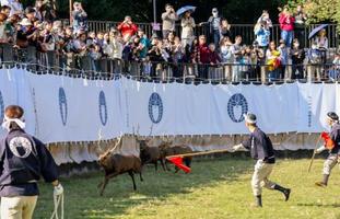 古都奈良の秋の伝統行事「鹿の角きり」が8日、奈良公園(奈良市)の鹿苑で始まった。逃げるシカを法被姿の勢子が追い込む攻防の末、神職役がのこぎりで角を切り落とすと、会場からは歓声が上がった。