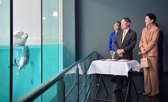 ラッコが水面から勢いよくジャンプし、水槽に張り付いた餌のイカをキャッチする様子に、両陛下は驚き、悠々と泳ぐジュゴンに「かわいい」と笑顔を見せた。水族館が取り組む生物の保全活動に関する説明も受けた。