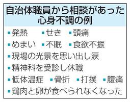 相談や訴えの内容には、防疫措置に従事した職員が発熱やせき、頭痛、不眠、食欲不振、「現場の光景を思い出して涙が出る」といった、身体的・心理的症状を訴えるものが見られた。精神科を受診し休職したケースや、ふん清掃時のガスで体調不良などの事例もあった。