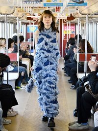 岐阜県羽島市と愛知県にまたがる毛織物の産地「尾州」をPRするファッションショーが8日、同市を走る名鉄竹鼻線の電車内で開かれた。毛織物会社の代表や服飾学生がモデルとなり、ウールの衣装を...