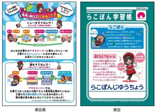 アオキスーパーでは、子ども達が身近に環境問題を意識しつつ、より一層楽しみながら学ぶことがで きるよう、それぞれの授業のテーマについて分かりやすくまとめた『らこぽん学習帳』を制作し、出前 授業で活用しています。