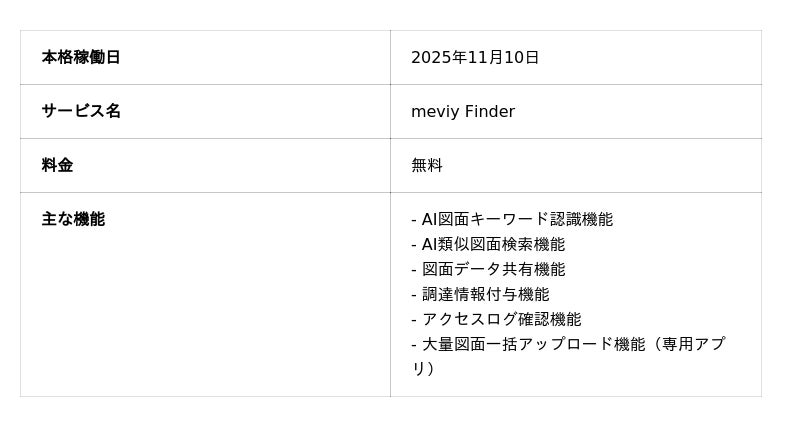 株式会社ミスミグループ本社(本社:東京都千代田区、代表取締役社長:大野龍隆)は機械部品の図面データ検索AI 「meviy Finder(メビーファインダー)」の機能をお客さまの声をもとに大幅に刷新し、2025年11月10日より本格的なサービス提供を開始します。meviy Finderは、過去の設計データを効率的に「整理・検索・共有」できる、完全無料の図面検索システムです。2024年8月のサービス開始以来、AIによる高度な図面解析とキーワード・類似図面検索により、製造現場の生産性向上を阻む「図面探しの時間」を削減してまいりました。